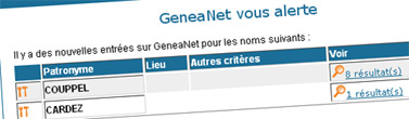 Vous utilisez peut-être les alertes sur les nouvelles entrées patronymiques dans la base Geneanet ? Depuis la fin juillet, vous avez probablement remarqué que l’e-mail vous était dorénavant envoyé au format html [1] et non plus au simple format texte.