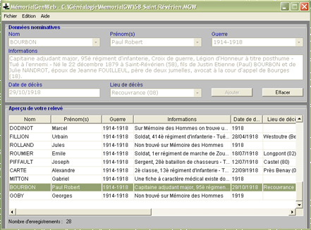 À Noël dernier (2006), j’avais eu la présence d’esprit de prendre le monument en photo pour relever les noms tranquillement de retour à Paris. Plusieurs mois après (humpf!), je m’y suis enfin attelé. MémorialGenWeb propose d’ailleurs pour ce faire un logiciel très simple dont l’interface de saisie des individus ressemble à cela : Interface de saisie - MGW