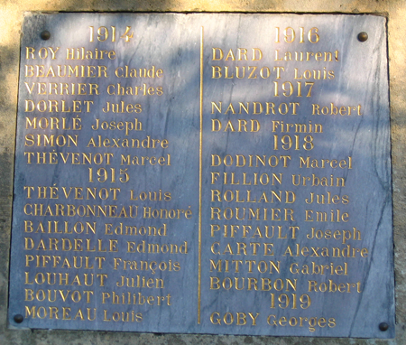 Par contre, j’ai absolument honte, car je crois me souvenir que le monument aux morts de Saint-Révérien compte également une plaque pour les morts de la seconde guerre mondiale et une autre pour l’Algérie ou l’Indochine. Et j’ai bien peur d’avoir uniquement pris en photo la plaque des morts de 1914-1918… Plaque des morts de 1914-1918 de Saint-Révérien
